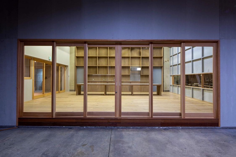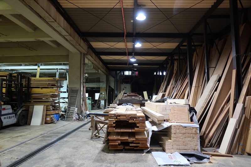 共用部の引き戸の向こう、奥にあるのは桃山建設の作業場。奥行きのある高い天井の下には何に使うのか分からないほど巨大なサイズの板や機械が置かれており、素っ気ない武骨な空間ながら、ものをつくってきた歴史が感じられるのが不思議なところ。