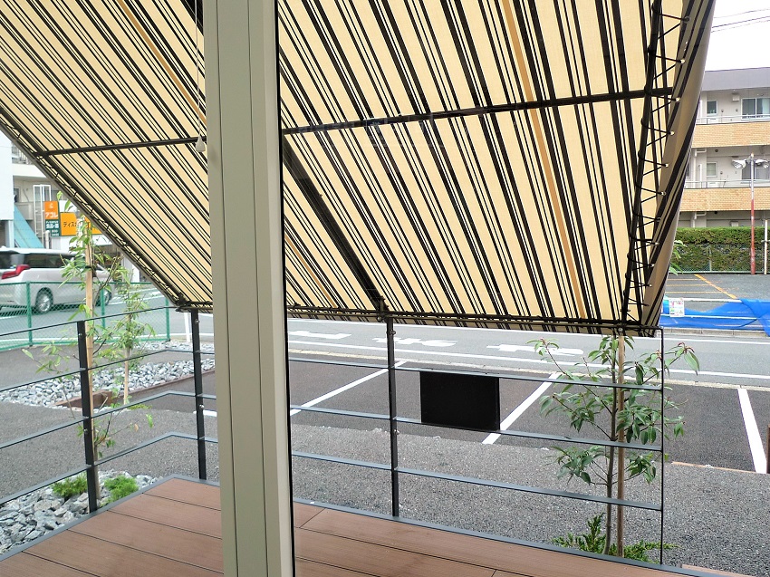 「エミキューブはテレワークで仕事に集中したり、趣味を思い切り楽しむための空間です。特別な時間を過ごす場所なので、外観の見栄えにもこだわりました。そこで、各室に取り付けたのが日よけシェードです。ユニットハウスの外壁の色が黒、敷地も黒いアスファルトなので、さわやかなストライプ柄のシェードを用いました。ここを利用する方にとっては、前面の窓から光を採り入れながらも外部からの目隠しになるし、デッキに椅子とテーブルを置いて、シェードの下、リゾート気分でくつろいでいただくこともできます」(渡部さん)
