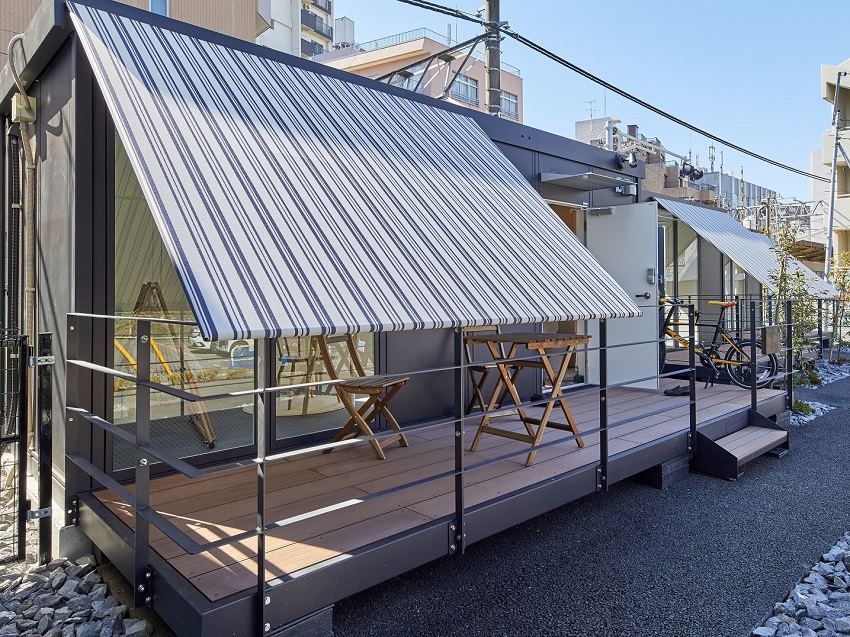 真横から見ると、こんな風景。ユニットハウス3室は、各室の独立性を高めるために、雁行(がんこう:各住戸を斜めにずらして配置する形式)の形式で配置されている(写真手前はレンタルスペースとして提供する3号室)物件は全3室が連結されたユニットハウスで、9.9m2タイプが2室と、11.9m2タイプが1室。いずれも坪数にして約3坪とコンパクトな室内に、トイレ(温水洗浄便座付き)、エアコン、洗面台、LED照明を備える。さらにはホームセキュリティ設備や、遠隔でエアコンや換気扇を操作できるIoT(モノのインターネット)機器を装備し、屋外にはデッキという具合に、安全・安心、快適な空間づくりへのこだわりがうかがえる。