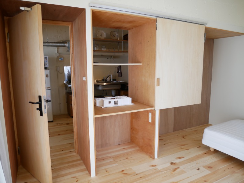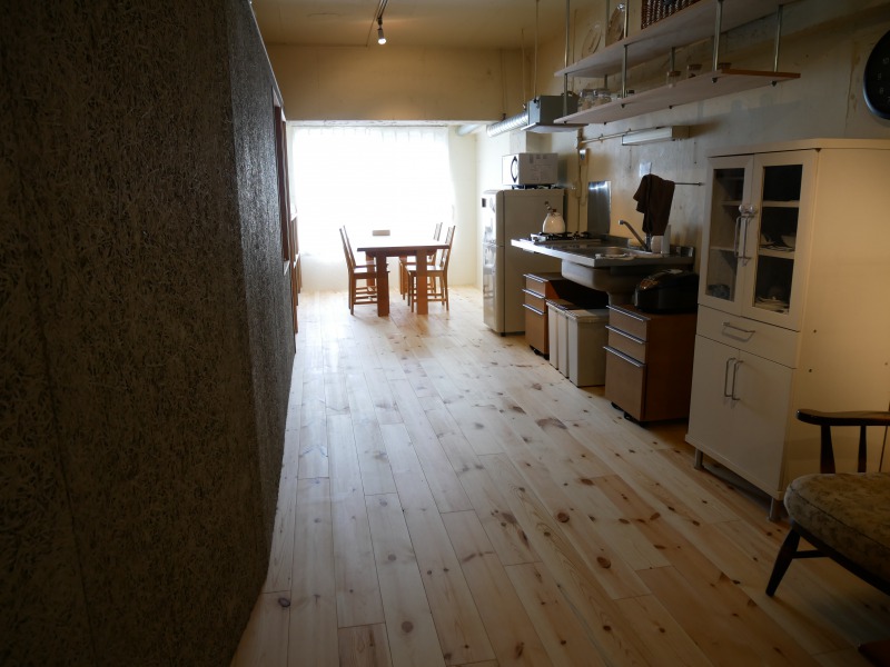 もともとは4DKだった部屋を大きなワンルームへと改築して貸し出していたものを、今回さらにリノベーション。3つの個室と共有のキッチン・リビング・浴室・トイレ付きのシェアルームとなった。