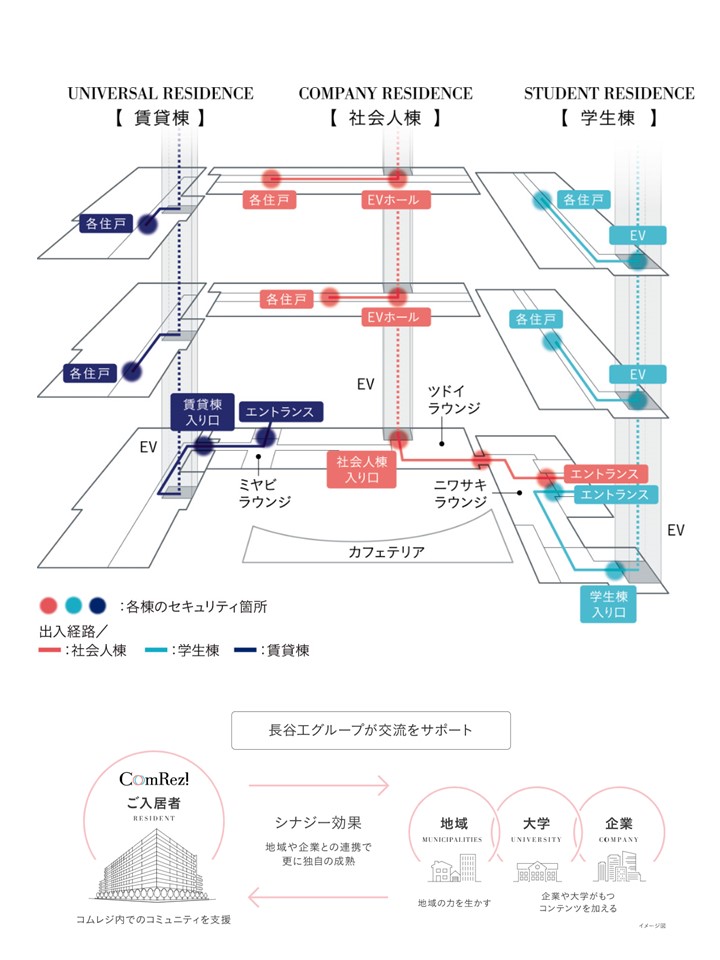 また、2022年2月下旬に完成予定の東京・赤羽の「コムレジ赤羽」でもICTを活用する。このコムレジは通常のマンションではなく、一般の「賃貸棟」、企業の借り上げ社宅を想定した「社会人棟」と学生向けの「学生棟」340戸からなる共創型レジデンスだ。多彩な共有施設とイベント・ワークショップを介して異業種・多世帯の交流で閃きや刺激を提供することをコンセプトにしている。フレキシブルな交流を実現しつつ、しっかりとしたセキュリティを保つにはどうしても認証は複雑になりがちだが、利用者に負担をかけずに実現を目指した。可能にしたのは、「顔認証」技術がベースにあるからだ。現在はコロナ禍のため共有スペースの是非は難しい議題だが、社会人棟の契約に前向きな企業も多く、来年以降、世の中が落ち着きを取り戻した際には魅力的住まいとして注目を集めそうだ。