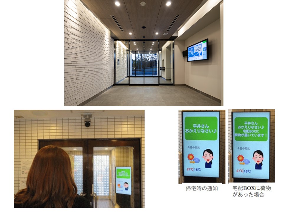 まず、エントランスの出入りは「顔認証」の技術が使われている。入居者本人を確実にチェックでき、鍵の紛失といった心配もない。顔認証でエントランスのチェックが完了すると、タッチパネル式のデジタルサイネージがパーソナライズされた情報を提供する。マンション内には宅配BOXがあるため、着荷の知らせや受け取りがされていない場合の催促などを行う。そのほか今日の献立や鉄道情報や天気予報といった情報も配信される。