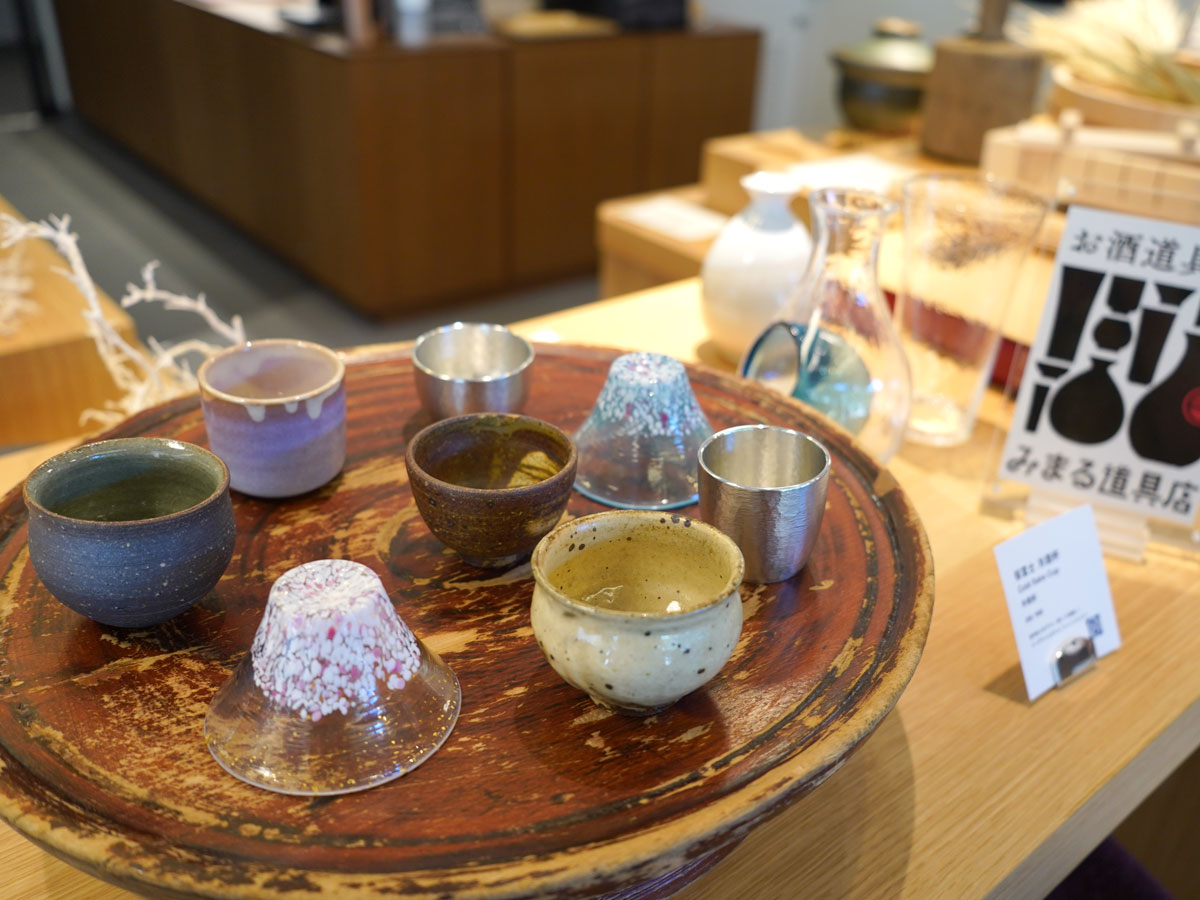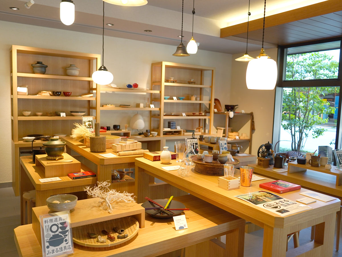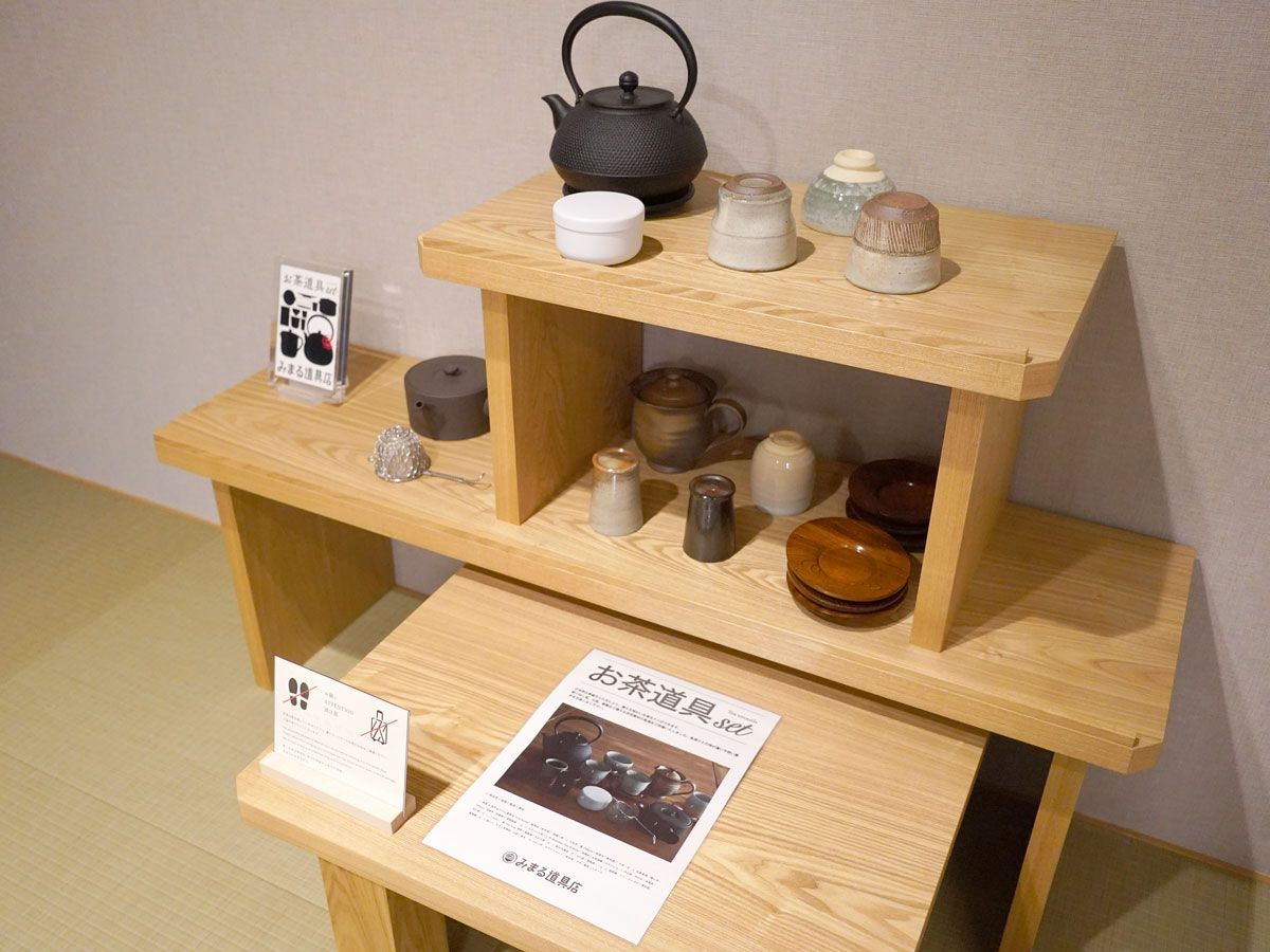 1階ロビーの一角にある「みまる道具店」には、おちょこや茶碗、土鍋や茶道具など、100点以上のさまざまな生活道具が並んでいる。これらの道具はすべて無料で体験OK。宿泊者は、好きな道具を客室内で自由に使うことができる。