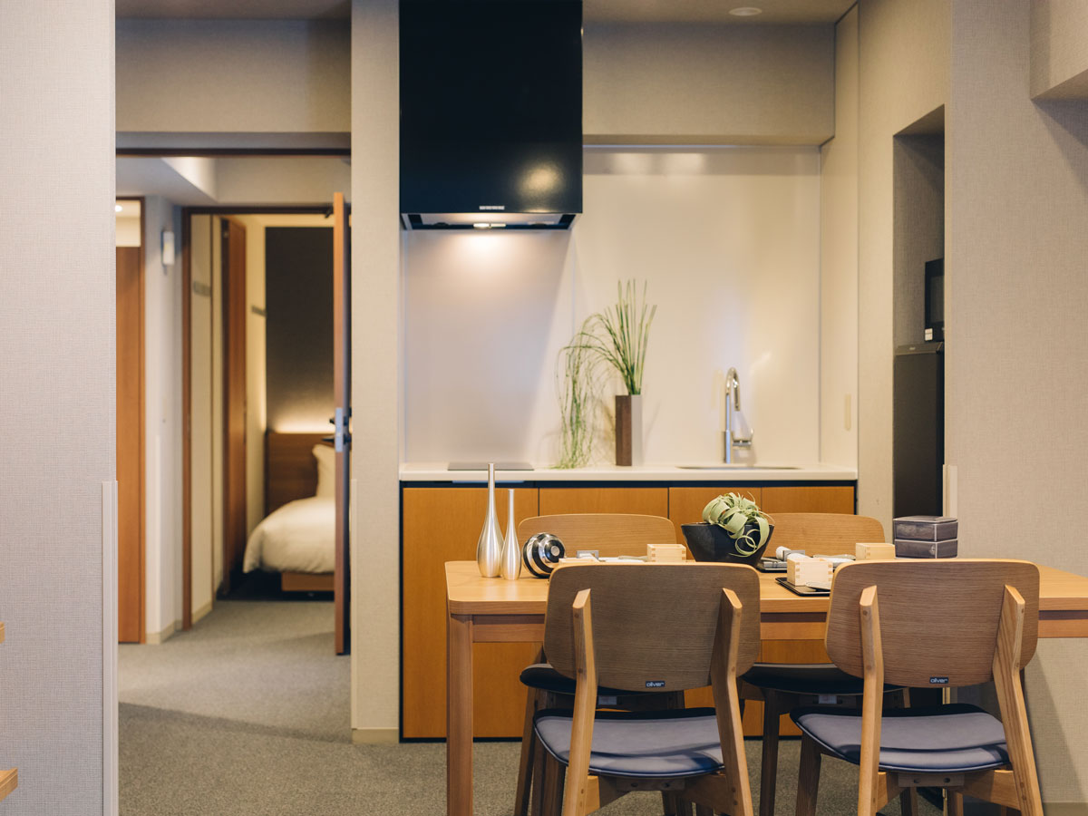 アパートメントホテル「MIMARU」は、全室にリビング・ダイニングキッチンがついていることが特徴。広い客室に「みんなで泊まる」をコンセプトに、約40m2、4名から泊まれ、 冷蔵庫・レンジや調理器具などが用意されているので自宅のようにゆっくりとくつろいで滞在することができる。