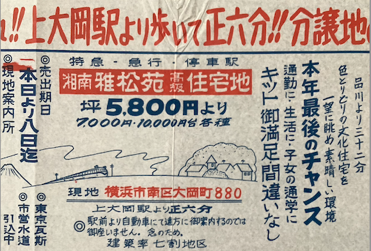 昭和30年代の住宅地分譲チラシの多くには所番地が書かれていない。例外は上大岡駅近くの物件である。後述する横浜市資料で取り上げられている地区とほぼ同じ場所である。昭和30年代に開発が始まった分譲地は、実は戦前からある程度開発されていた地区なのであろうと推察される。