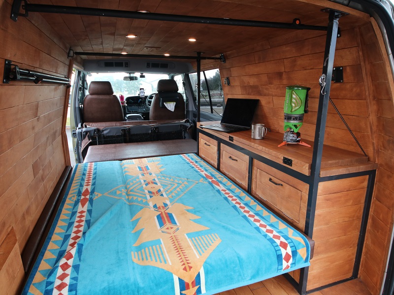 ウレシカ全体では4台を運用していて、小型トラックをベースに専用の居室をのせた「キャブコン」タイプは、この愛犬用の1台に加え、ラグジュアリータイプが1台、ダブルベッド仕様が1台。残る1台はハイエースをベースに独自にリメイクし、木を基調にした内装にした。
