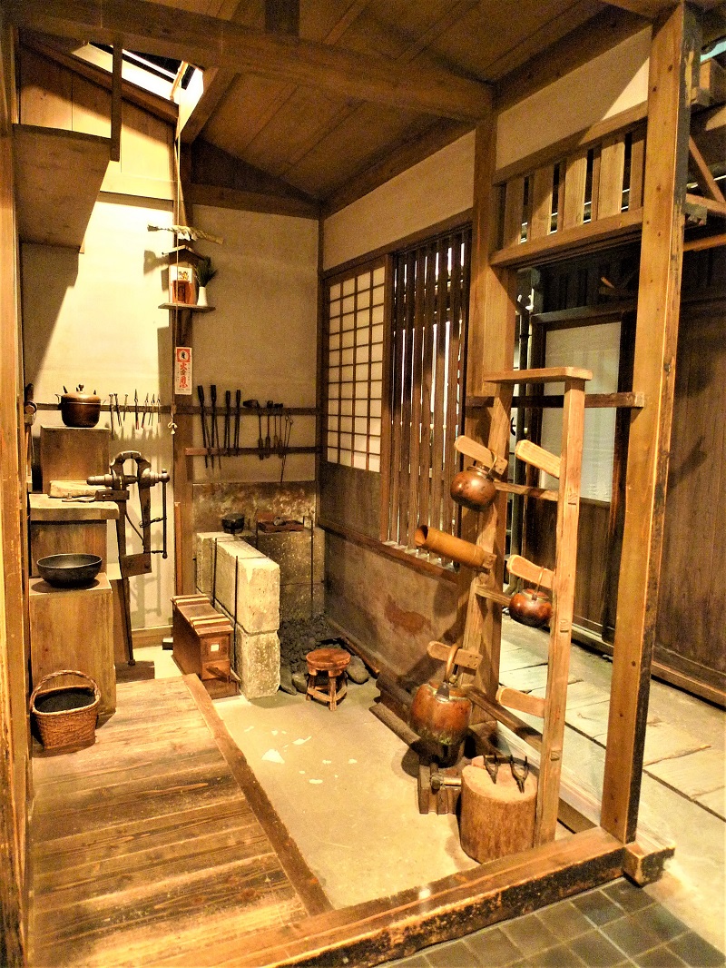 路地の奥へ進むと、目に入ってくるのは銅壷屋の作業場を再現したスペース。江戸時代から、下町は職人のまちといわれ、足袋づくり、菓子の木型製作などさまざまな職人が暮らしていた。そんななかに銅壷職人がいる。今ではほとんど見かけなくなったが、銅壷屋はまちの鍛冶屋として、下町の暮らしに身近な存在だった。