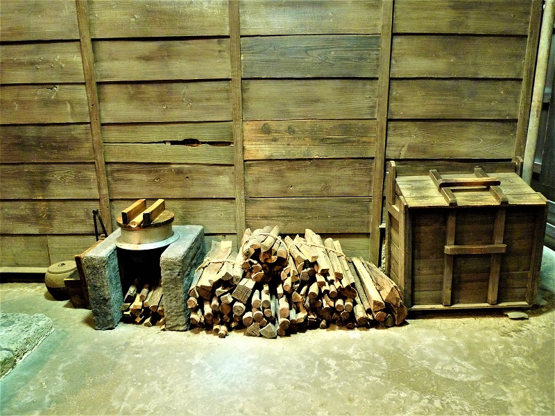 座り流しの周りには、ご飯を炊く釜、七輪(炭を使って煮炊きをする小型コンロ)、飯櫃(めしびつ)などが置かれている。土間に設けられた狭い台所だが、壁には調理道具がかけられていたり、棚があり、壁を収納スペースとして有効活用しているのが印象的。