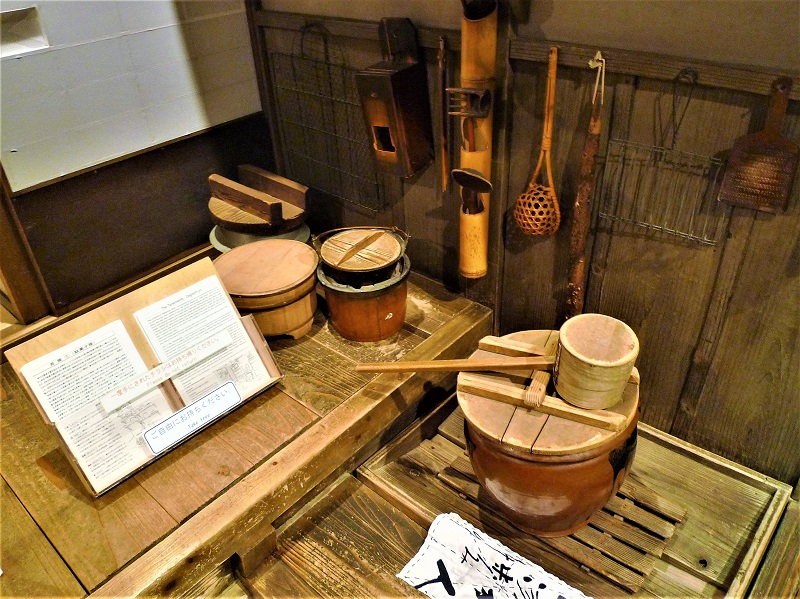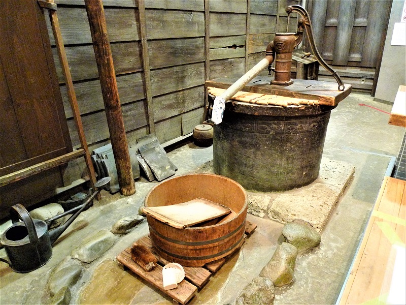 長屋の台所には、水がめも展示されている。当時、水がめは生活必需品。水道設備が普及しておらず、蛇口をひねれば水が出るという時代ではなかった。手桶などで井戸から水を汲み、運んできた水を、水がめに貯めていたのだ。井戸は屋外にあり、場合によっては遠くまで水を汲みにいかなければならない。しかし、井戸水を汲んで貯めておける水がめがあれば、流しの横などに置いて飲料用にしたり、調理、洗い物など、必要なときにすぐに使うことができた。水がめの容器に用いたのは陶磁器で、水に浮いた不純物を沈殿させる浄化の役割も担っていたという。容器の容量は1~2日分の使用量に合わせて5斗入り(約90リットル)、3斗入り(約54リットル)のものが多く、少人数の家庭では2斗入り、1斗半入りのものも使われていた。