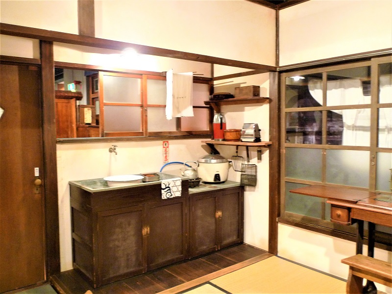 駄菓子屋の店頭と向かい合わせて再現されているのが、当時の台所の様子。流しは木製で、台所の床の一部を一段下げてつくられた「座り流し」になっている。現代の台所は調理台やシンクが備わり、立ち仕事が基本だが、その昔はしゃがんで煮炊きをしていたというから驚いた。