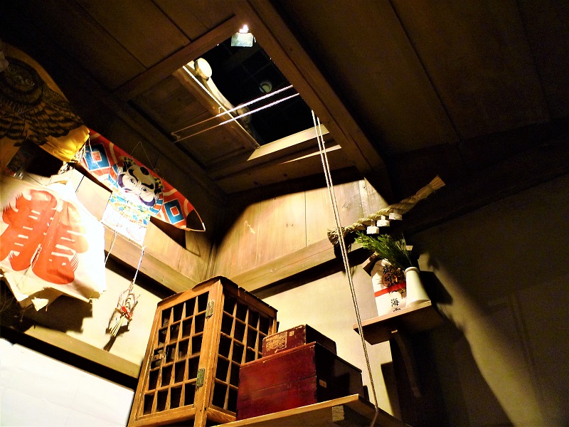 天井には、小さな窓と紐があるのに気づく。これは引き窓で、紐を引いて開閉する。