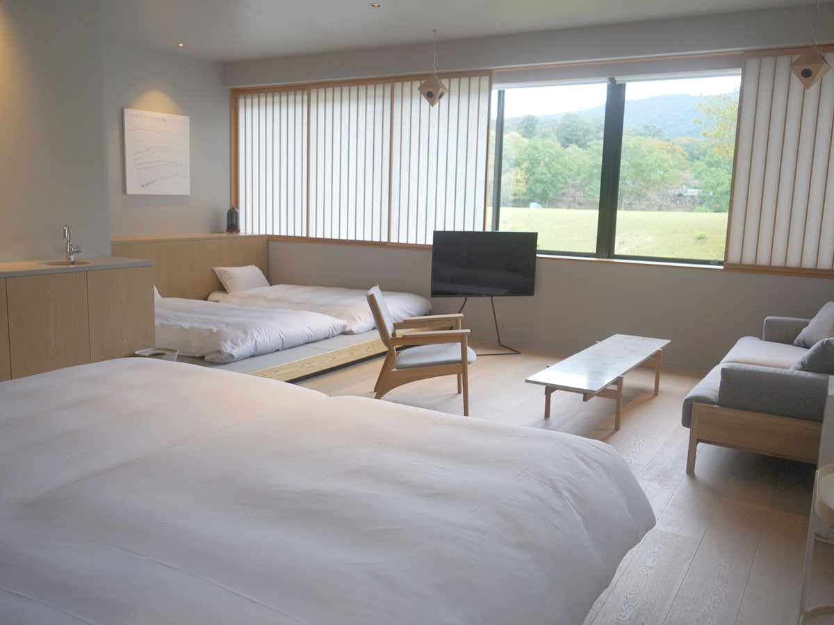 客室は全44室。ファミリーやグループ利用にも対応できる4名定員の部屋と、2名定員の部屋サイズを展開。ワーケーションの需要が増えている中、部屋でも仕事ができるように、カウンターデスクとチェアーは多くの部屋(20部屋)に用意されている。