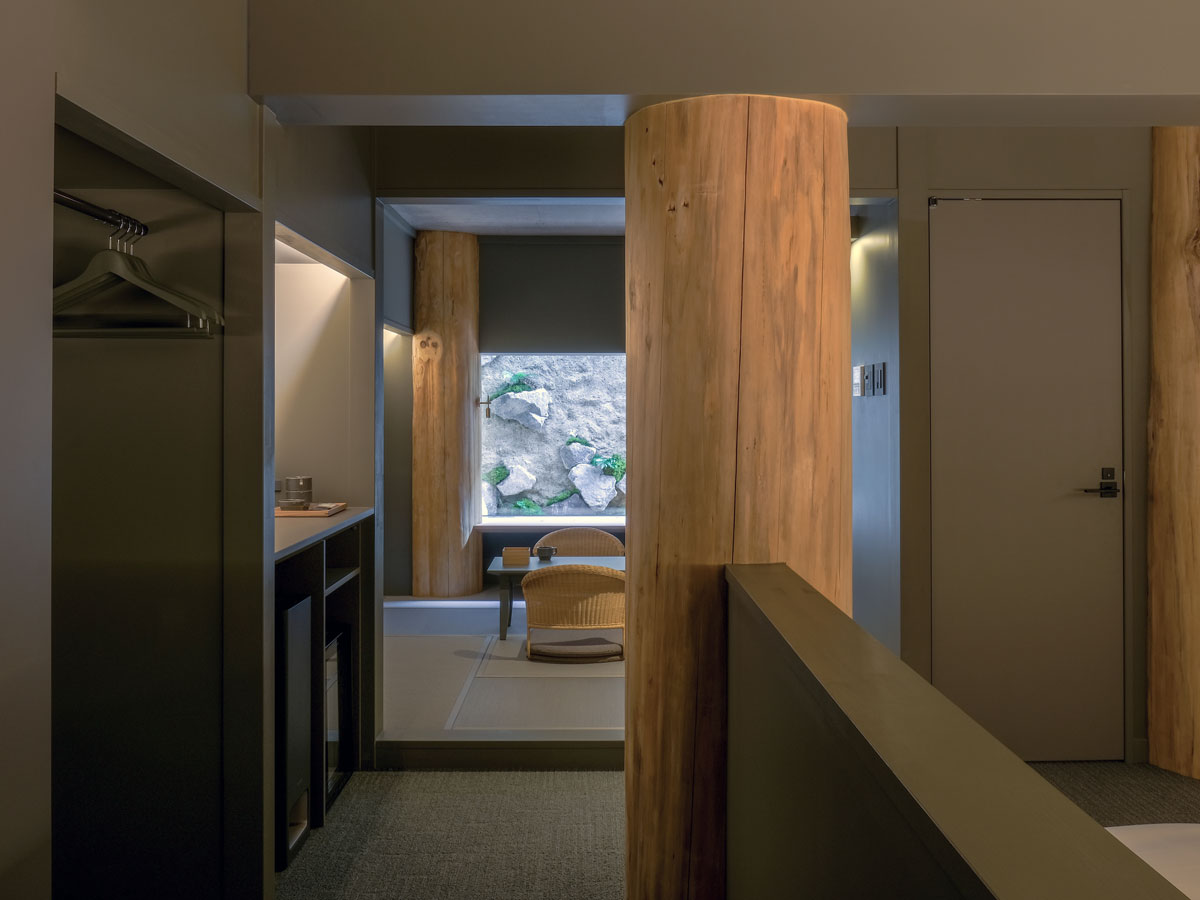 B1のLOUNGE / TEA TABLE、客室(B1階)とホテルエントランスのランドスケープは、佐野文彦氏(Fumihiko Sano Studio)が監修。吉野杉や飛鳥石など奈良の素材を大胆に配し、奈良にふさわしいプリミティブな魅力が感じられる空間デザインを設えた。B1フロアのラウンジ空間は、ストーンヘンジや石庭をイメージさせる、ほかの階とは雰囲気を逸する異空間。負のイメージをもたれがちな地下の階に、新しい魅力を提案している。