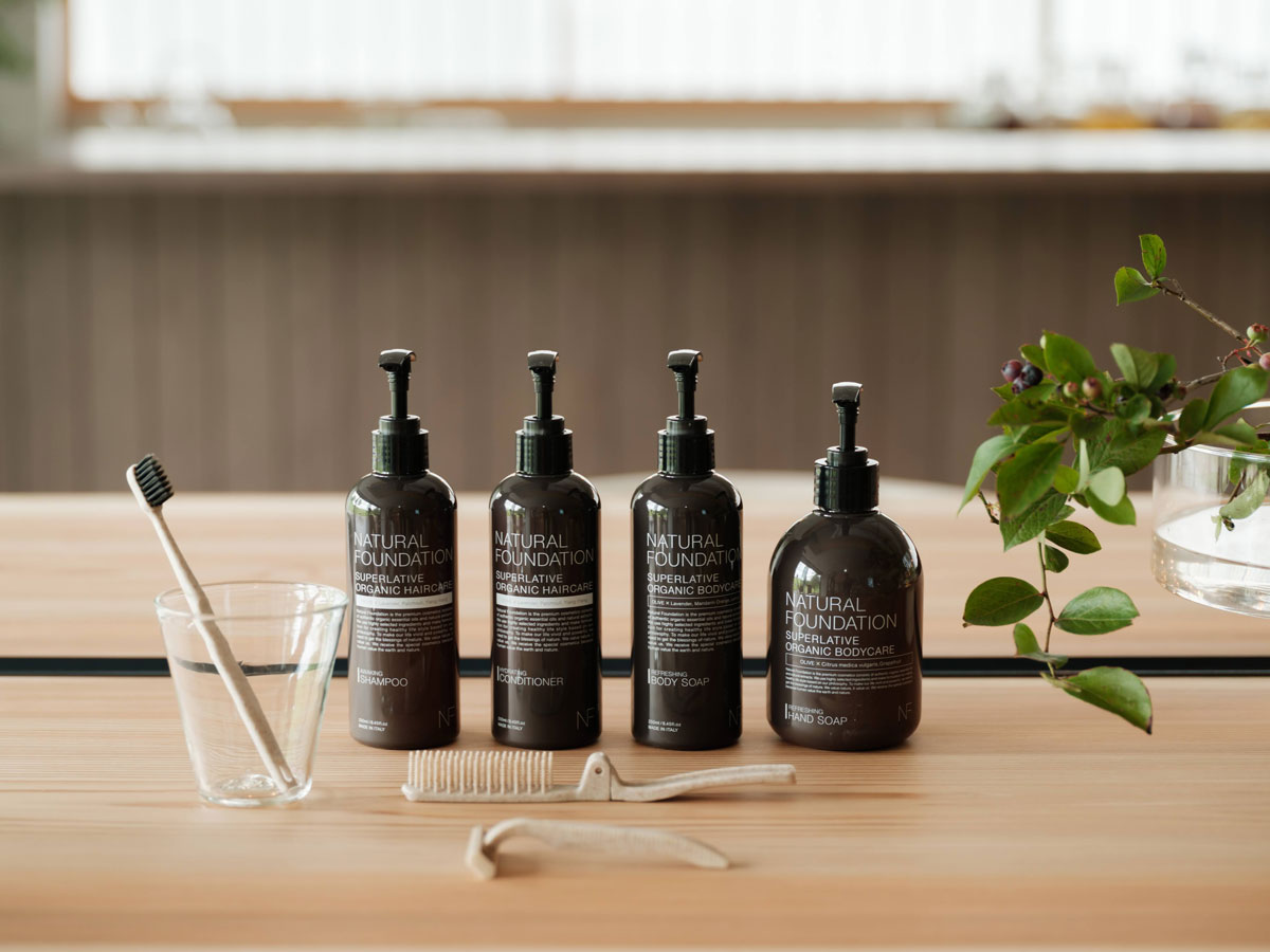 「MIROKU 奈良」の大きな特徴のひとつは、未来の環境への配慮だ。既存建物のサッシ部分に断熱性の高い障子を設置し、省エネルギー化を実現。新たに再生可能エネルギーを電力として導入している。海外旅行客には、環境への関心度が高い人も多い。プラスチック削減に配慮し、藁を編み込んだアメニティ(歯ブラシやくしなど)やオーガニック認証を取得しているシャンプーやコンディショナーなどを採用するなど、環境をはじめサステイナブルな社会への継続的な取組みもスタートした。