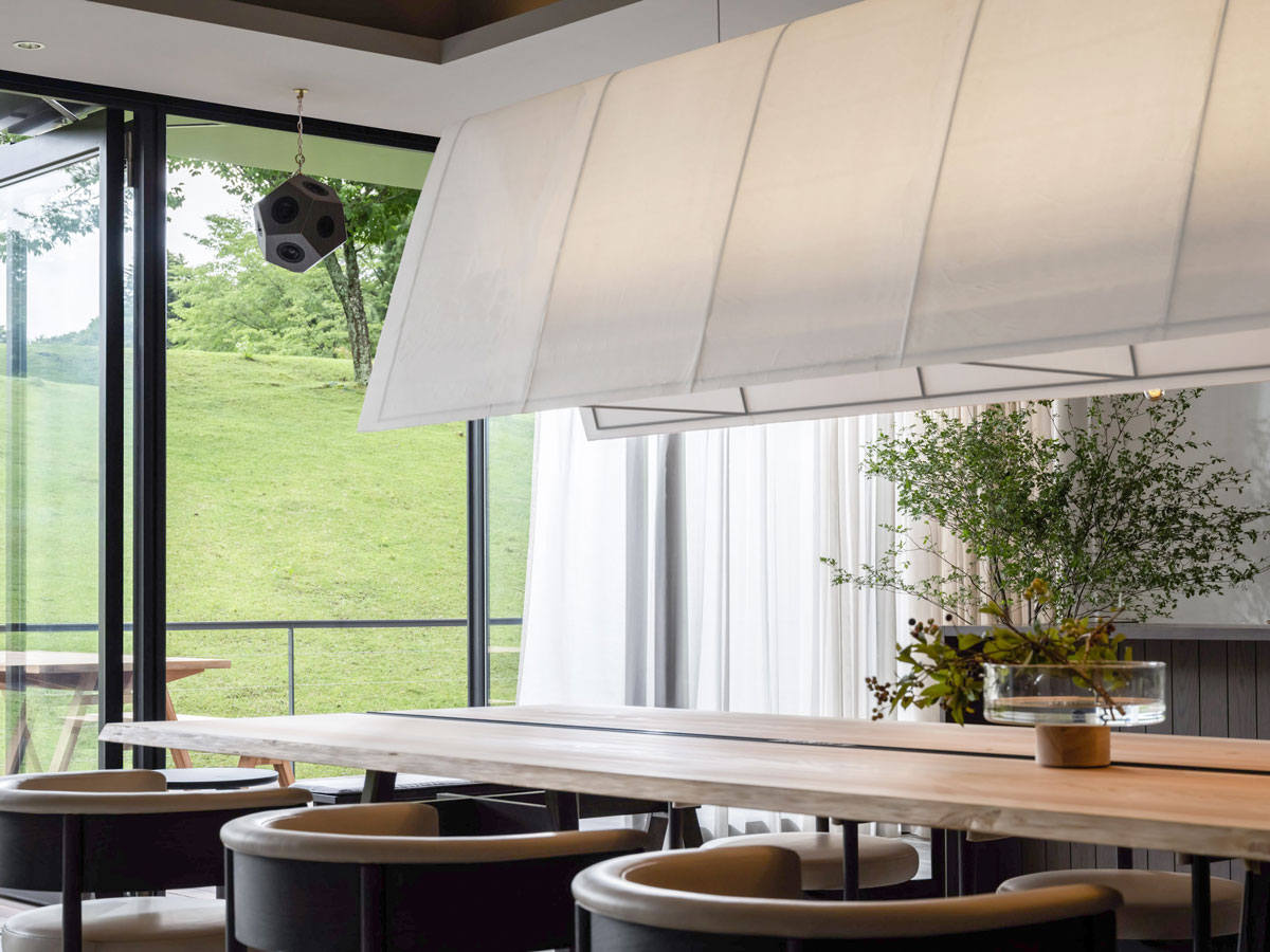 1階のCAFE & BAR MIROKU TERRACEと客室(2〜4階)は、芦沢啓治氏(芦沢啓治建築設計事務所)が担当。シンプルで美しい、普遍的な設計を得意とする芦沢氏による和のインテリアが魅力で、1階のCAFE & BAR MIROKU TERRACEは、テラスまで地続きの開放的な木調空間となっている。