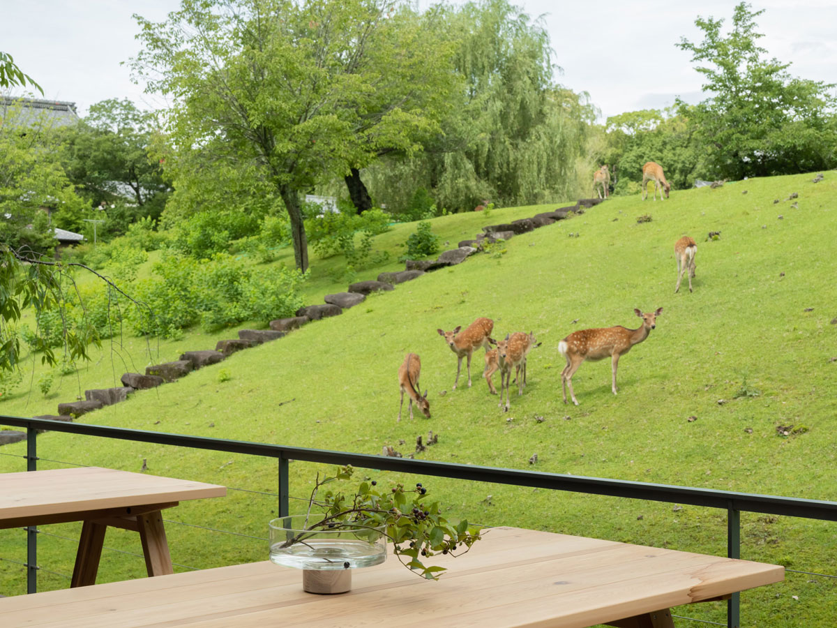 施設内の飲食店を、地域の店とコラボするのも「THE SHARE HOTELS」の特徴。CAFE & BAR MIROKU TERRACEのメニューを監修したのは、奈良市内の人気カフェ「くるみの木」。奈良の地域食材をふんだんに使った和洋2種類の朝食や、地域のクラフトビールや果実酒などが提供される。テラス席にいると、まちに住む鹿たちが草をはむ様子が近くで見られるのも、奈良ならではのエンターテインメントだ。