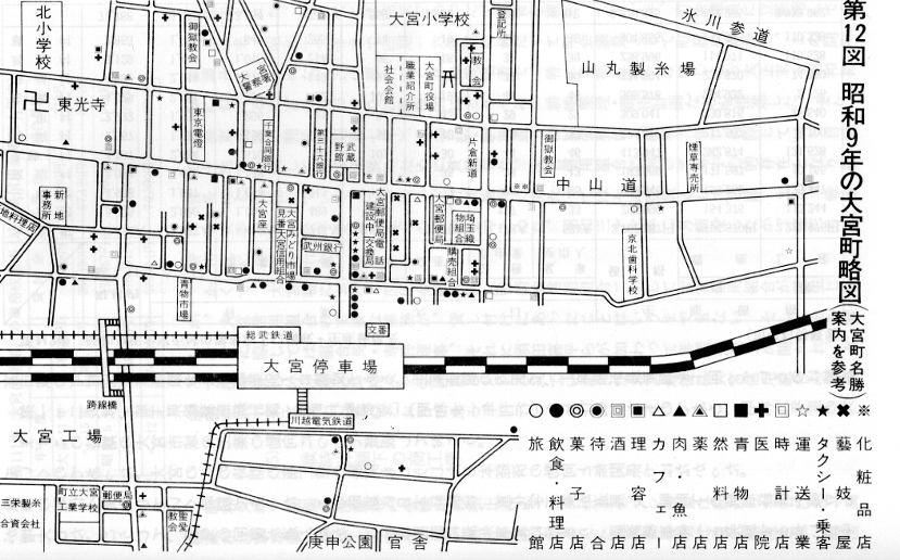 盆栽村から東武鉄道の南側に行くと、大宮公園である。大宮駅開設は商工業の発展にも大きく寄与し、旅館、料理店、運送店、馬車発着所などが駅周辺にでき、各種の問屋も増えたが、観光客も多く、料亭、待合、その他の風俗営業もにぎわった。1900年(明治33年)には大宮三業組合が設立され、全盛期には置屋31軒、芸者85人だった。