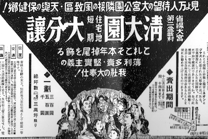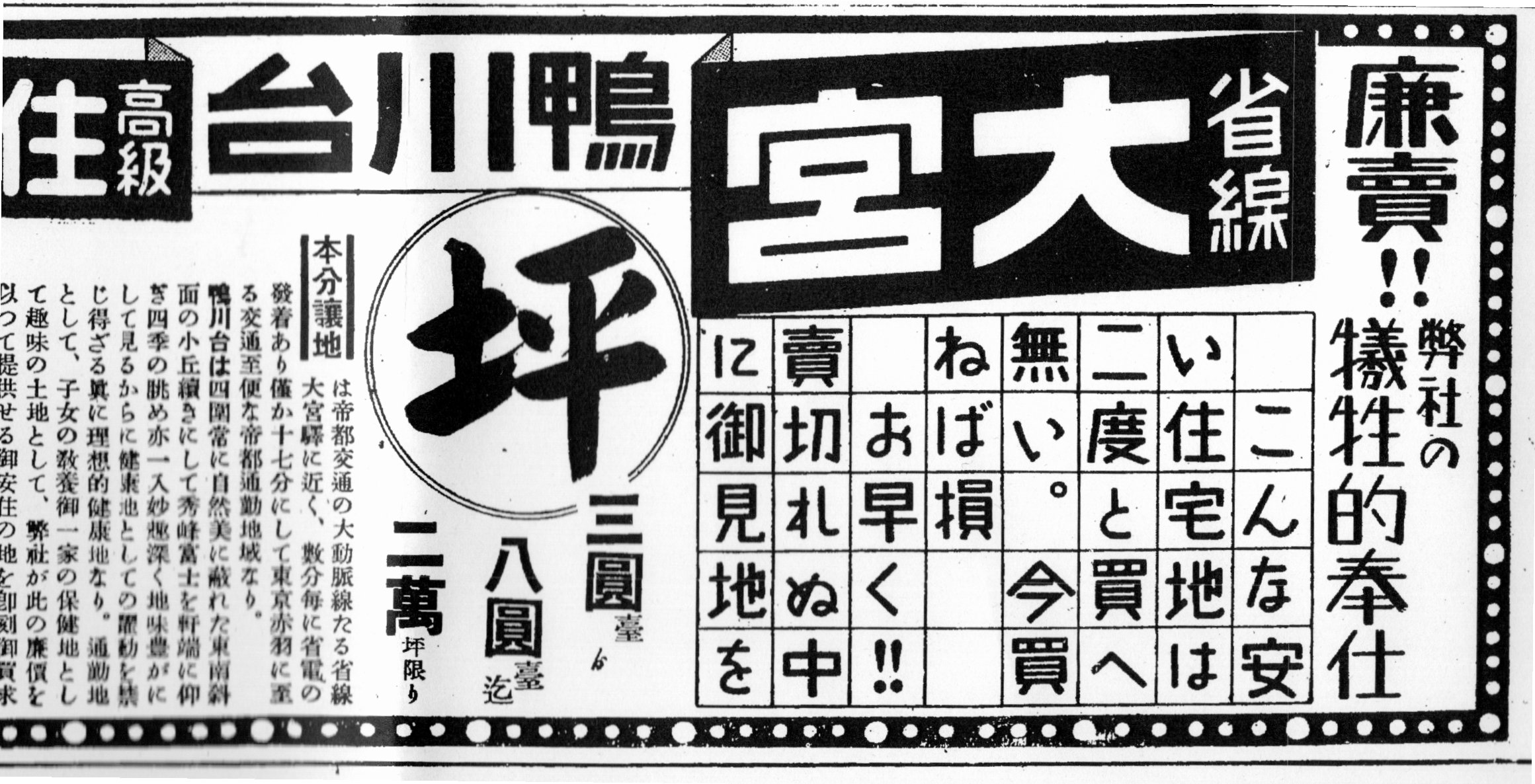 戦前の新聞広告には鴨川沿いの台地と思われる鴨川台や盆栽村・清水園という物件がある。このように大宮駅周辺では戦前から戦後にかけていち早く住宅地開発が行われていたようなのである。