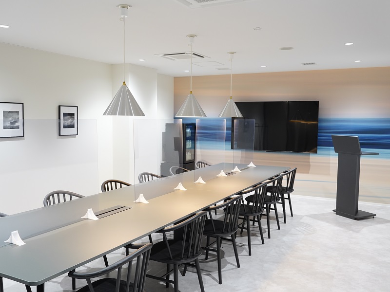 もう一つ共用スペースとなるのが会議室。4階と5階で約40室を完備。採用面接などにも対応できる70席ほどの大会議室のほか、オンラインミーティングにもぴったりな個人ブースもある。「大きいサイズの会議室は各企業さまで利用頻度が減った状況があり、それを共用にすることでオフィス面積のスリム化ができます」と高須賀さんは説明した。