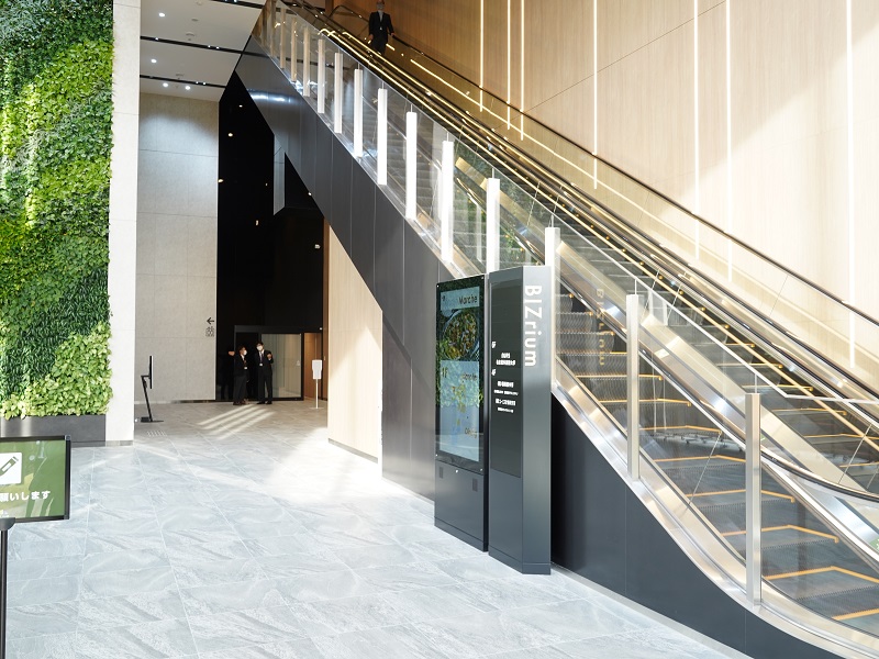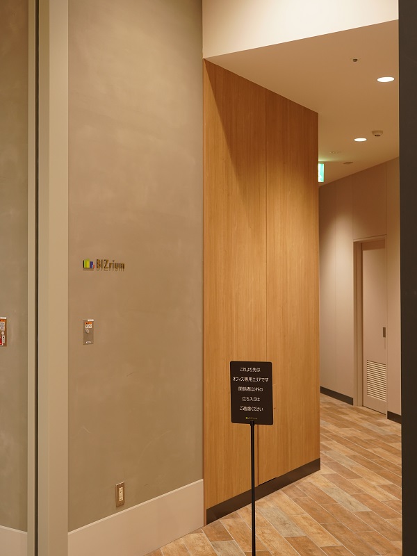 「BIZrium名古屋は1階のメインエントランス奥とオフィスフロアに上がるエスカレーターのある3階から、扉一枚で商業施設へと続きます。難しかったのが、ダイレクトにしてしまうと買い物客の方もオフィスゾーンにアクセスしやすくなってしまうこと。そのため10歩分ほど廊下で距離を設け、もちろんセキュリティもしっかりとしました」