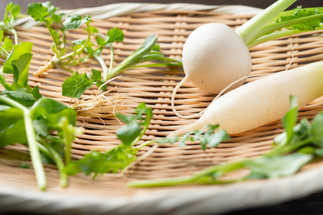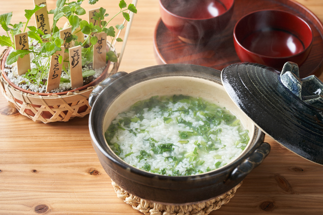 七草粥は、人日の節句に食べられる春の七草を炊き込んだシンプルな塩味の粥。焼いた餅を入れるなど、地域による特色もある。冬に生える若菜から、生命力をもらうまじないでもあるが、冬に少ない青菜類でビタミン不足を補い、お正月に食べ過ぎて酷使した胃を休めるという意味もある。