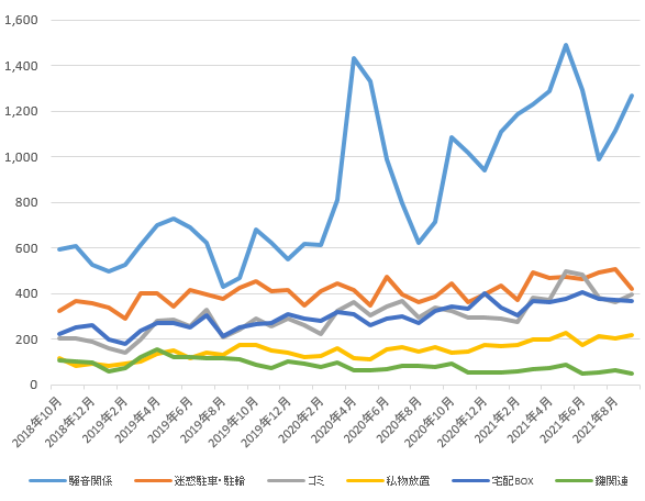 それ以外でもゴミ問題が約1.6倍(前々年比。以下同じ)、私物放置、宅配ボックス問題がそれぞれ約1.5倍、迷惑駐車・迷惑駐輪が約1.2倍となっており、減ったのは鍵関連のみ。鍵関連に関しては前々年比で0.5倍、つまり半減しているが、これは外出しなくなったため、鍵を紛失することもなくなったというのが理由と思われる。