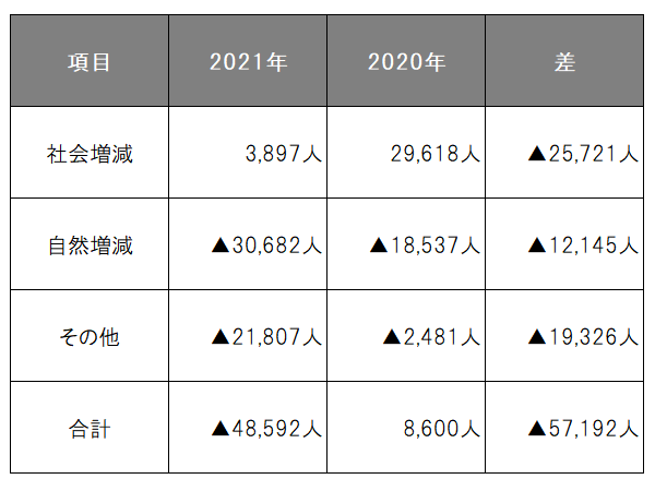 一方で、1年前の2020年においては東京都の人口は8,600人増加している。2020年の内訳は、社会増減が29,618人増加、自然増減が18,537人減少、その他が2,481人減少となっている。