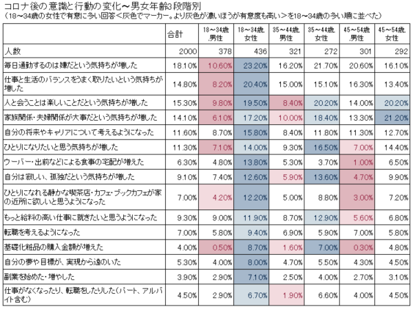 変化が大きいのは通勤時間が長い郊外の住民である。東京23区の住民は毎日通勤するのは嫌だという気持ちが増したという回答が20%以上あるほかは、すべて20%未満の回答しかなかった。