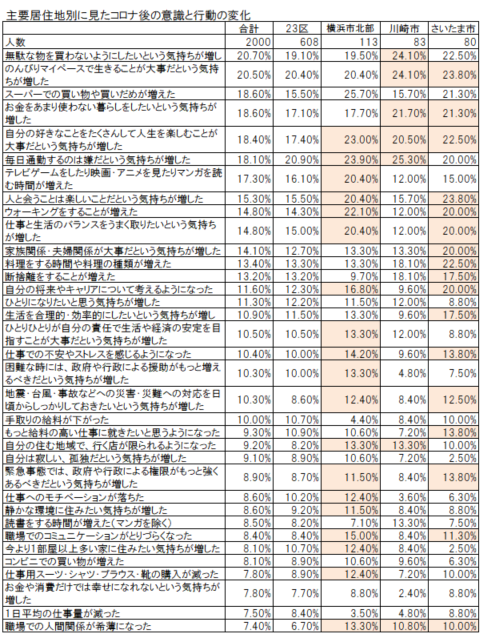 各選択肢で20%以上回答した選択肢の数を見ると、横浜市北部(西区、青葉区、港北区、都筑区、中区など)とさいたま市の住民が最も多い。東京都心部に通勤する人の割合が高い郊外住宅地と思われる地域で、コロナによる意識と行動の変化が大きいのはうなずける。