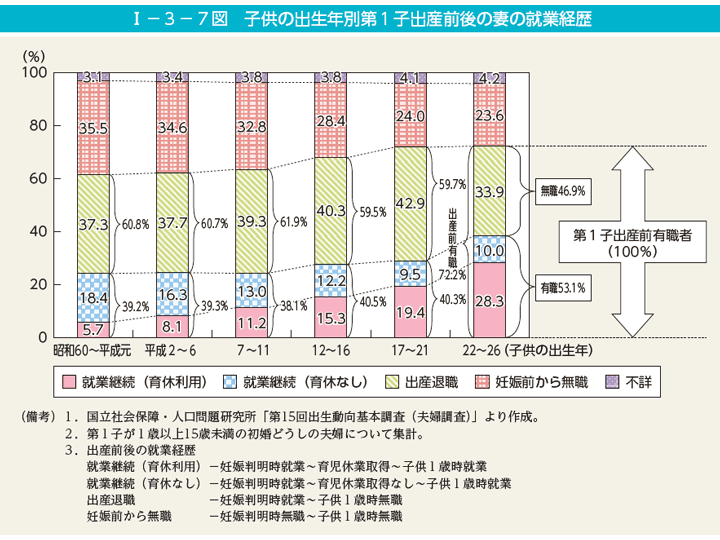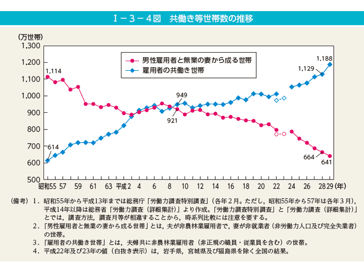 日本が戦後の復興と高度経済成長の中で、労働力として期待される中、共働き世帯は増加を続けている。1985年に男女雇用機会均等法が成立し、1991年に育児休業法、1993年にパートタイム労働法、 2003年に次世代育成支援対策推進法、2015年に女性活躍推進法が成立し、主に女性の就労環境を改善する法律が整備されてきている。