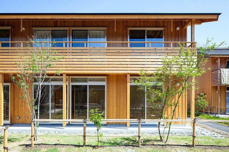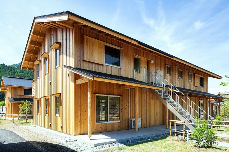 公共事業で住宅が建設される場合には全体を一括で発注、一気に作ってしまうことが多いが、神山町では全20戸を1棟ではなく、2階建て8棟にし、工事を全部で四期に分け、4年をかけて少しずつ建ててきた。これは地元の材を使って地元の大工で作るため。