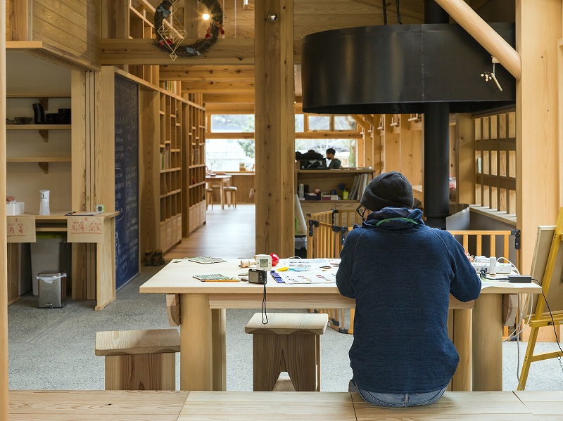 もうひとつ、敷地内には地域の人たちのリビングであり、図書室であり、自由に使える「鮎喰川コモン」というコモンハウスも作られた。前述したように神山町は川沿いに細長く広がっており、子どもたちはバス通学などをしており、学校以外にみんなで集まって遊ぶ場所が少なかった。鮎喰川コモンは子どもたちの遊び場として機能することを意識したスペースなのだ。