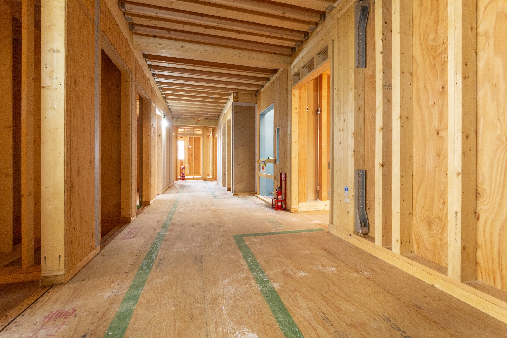 「製造面でも施工面でも、極力既存の工場ラインや職人の技術をそのまま使って対応できるようにしました。再現性を持たせ、普及型にしたことがポイントです」(依田氏)というように、耐力壁にしても遮音床にしても、今後の木造マンションの普及を見据えて取組んでいる。高コストとなるCLT(直交集成板)などを使っていないのもそのためだ。