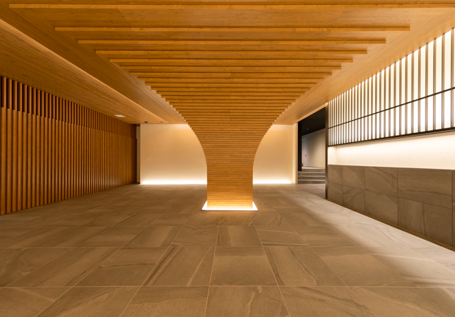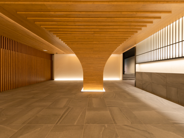 「MOCXION INAGI」のエントランスホールを入ると、大きな木の造作をはじめ、木のイメージを前面に出したデザインが迎え入れてくれる。この部分は、三井不動産グループが北海道に保有する山林の間伐材を使用して仕上げた。