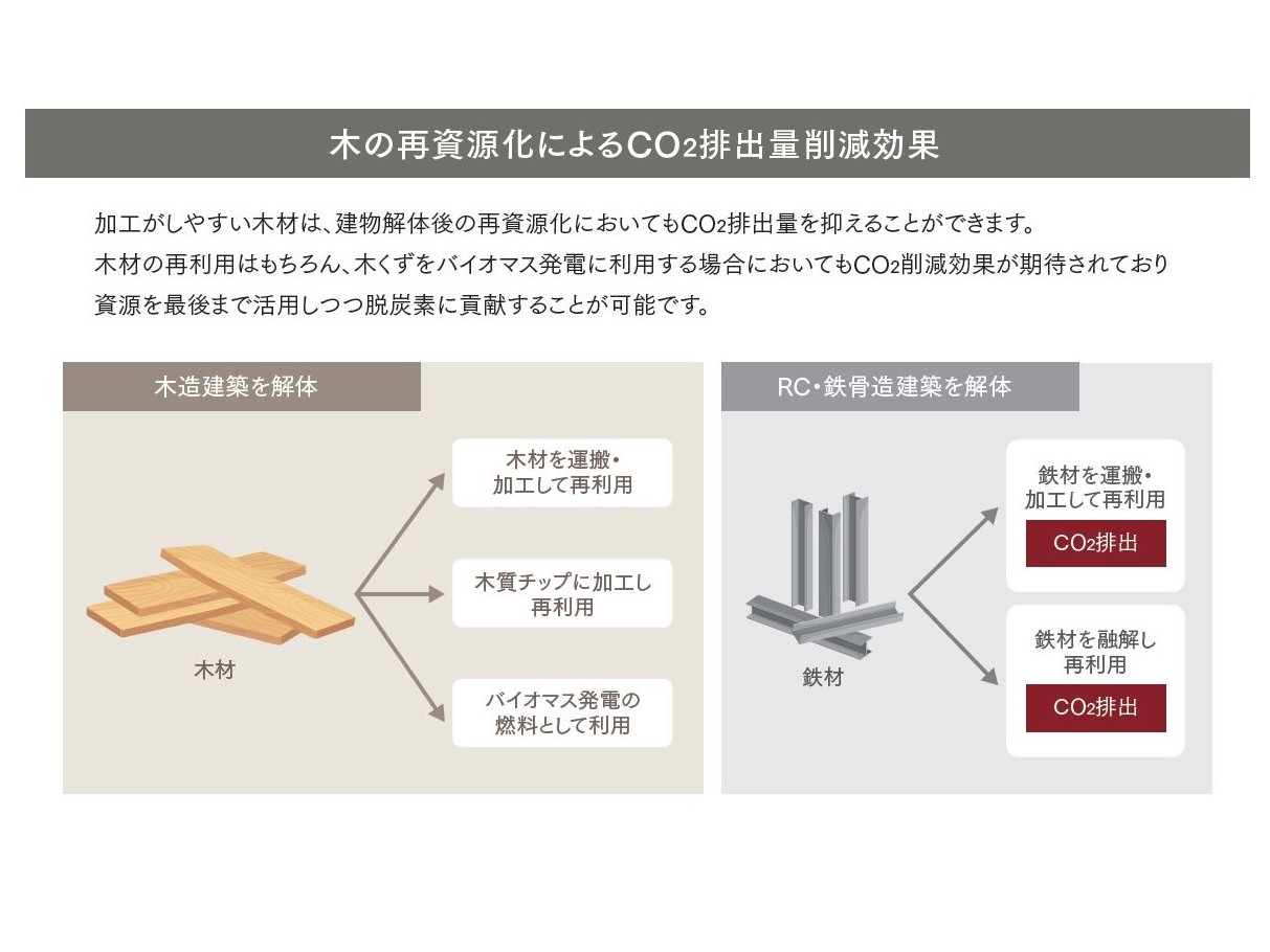 ひとつは建設時。建設時には地盤改良工事等を行うことがあるが、RCと比べて軽量の木造なら、その工期とコストを削減できる。