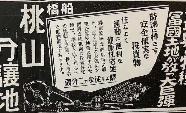 新聞広告を見ると、戦前の船橋駅北口には桃山分譲地という住宅地が分譲されている。広告の地図はかなり適当であるが、駅から徒歩2分弱と書かれておりほぼ駅前である。今はそこには住宅地らしいものはなく、オフィスビルか東武百貨店になっているかもしれない。戦前はこんな駅前も新興住宅地だったのだ。