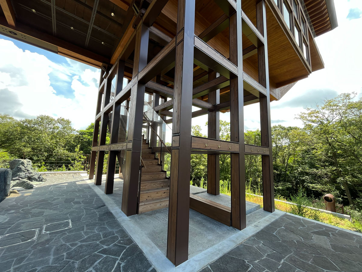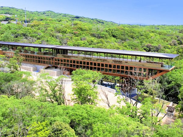パソナグループの株式会社awajishima resortが運営する「禅坊靖寧」は、淡路島の北の玄関口・岩屋港から車で約10分の場所にある。建築家・坂茂氏による、まさに森に浮かぶ建築。約3,000m2の広大な敷地に、全長約100mの架構が、崖に突き出すように森の中に真っ直ぐと延びている。急斜面の敷地を前向きに生かし、森の上空に建物を浮かべる構造にすることで、土地の造形にかかる工事の負担を減らすことも可能にしている。全体構造の85%は木造を使用。そのうちの80%が杉の木で、強度の必要な要所要所には松の木が用いられている。