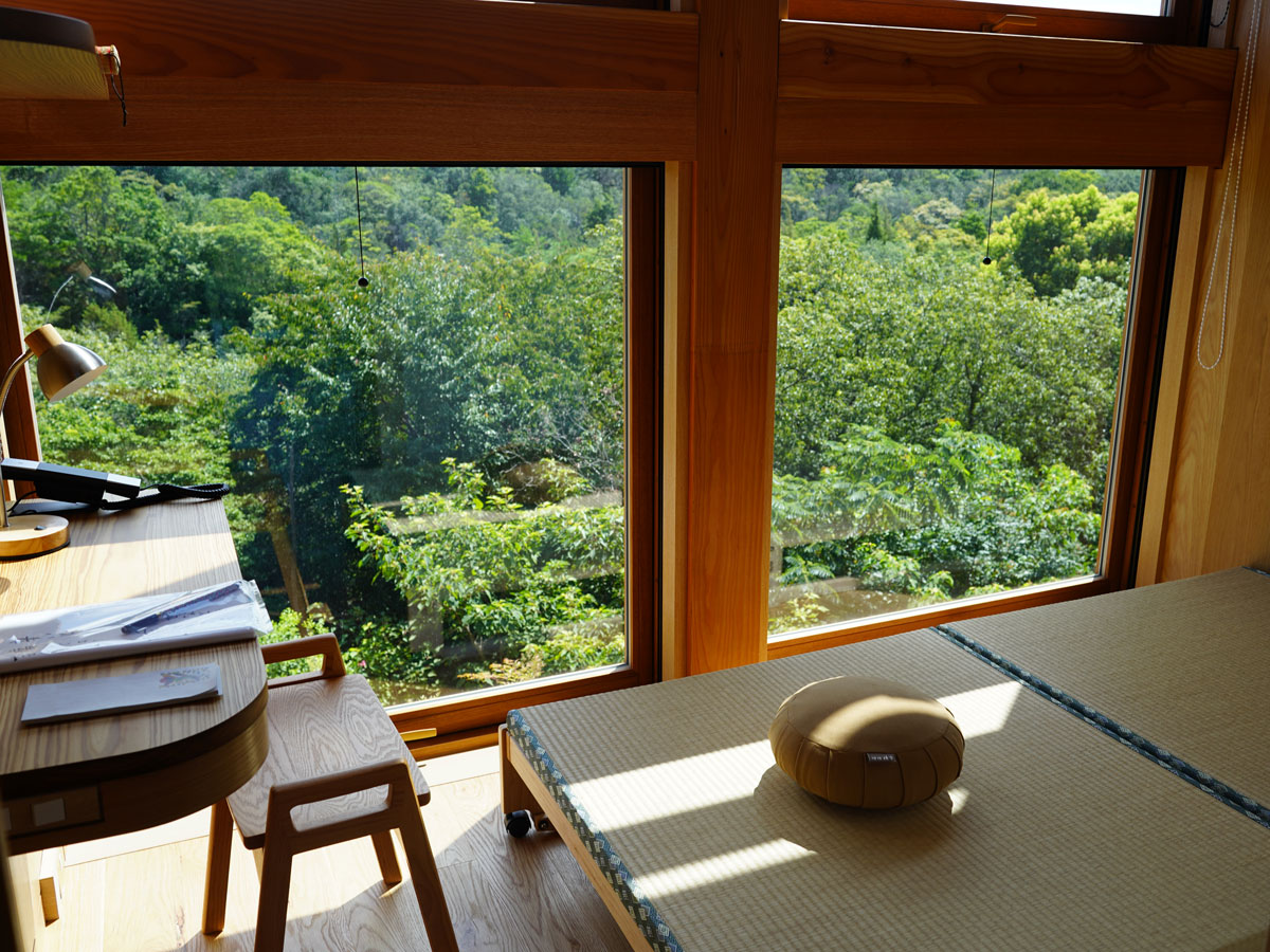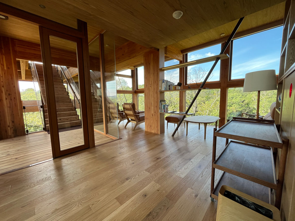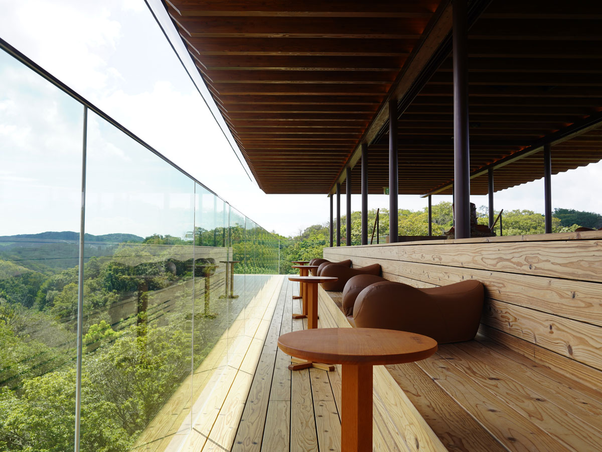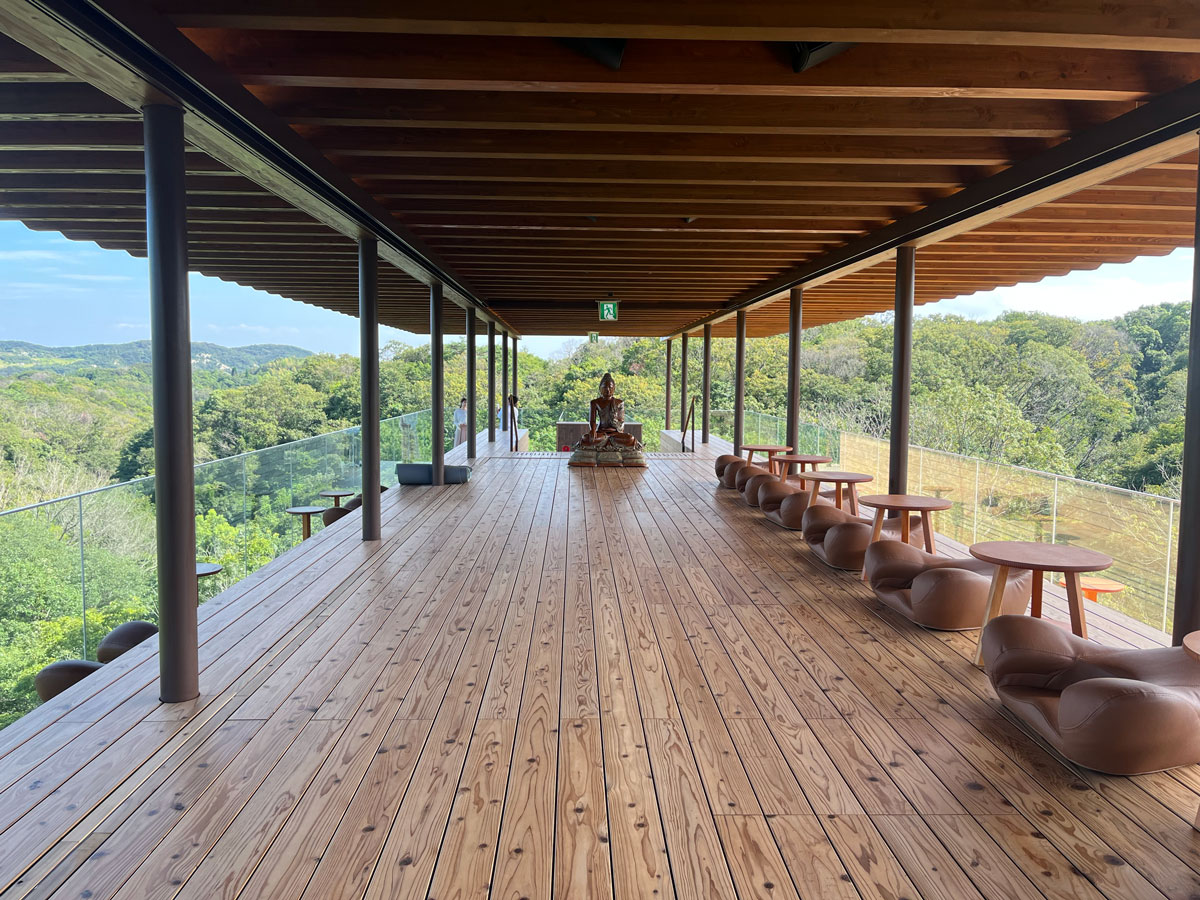特徴的なのが「禅デッキ」だろう。長さ81mの長大なデッキは、ハシゴ状の構造形式を用いて実現された。一番のこだわりは、目線が山の稜線を越えないこと。デッキの開口部に天井以外ほとんど視界をさえぎるものがなく、360度見渡せる。自然の中にすっぽり包まれた状態を感じてもらうための心遣いだ。ゲストはこのデッキから360度パノラマの大自然に包まれて、ヨガや瞑想、食事、ZEN茶やZEN香などの座禅リトリートを体験することができる。雨戸のような折りたたみ式のガラス窓が収納されているので、天候が悪い際も即時に対応できる。