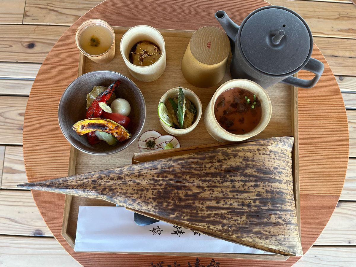落ち着いた心のまま迎えるのは、禅坊料理とZEN茶。メインとなる禅デッキで行われるヨガ・瞑想に加えて、発酵王子こと伏木暢顕氏が監修した禅坊料理も楽しみの一つ。日本ならではの精進料理をベースに発酵食をアレンジに加えて、胃に優しく消化に良いものが使われているオリジナル料理だ。肉を使わず、調理に油を使わない。砂糖の代わりにてんさい糖やアガペシュガーなど植物性のものを使用する。自分で点てる抹茶のご自服も、心が整う良い時間だ。和菓子も季節によって変わり、四季折々の風味を楽しめる。