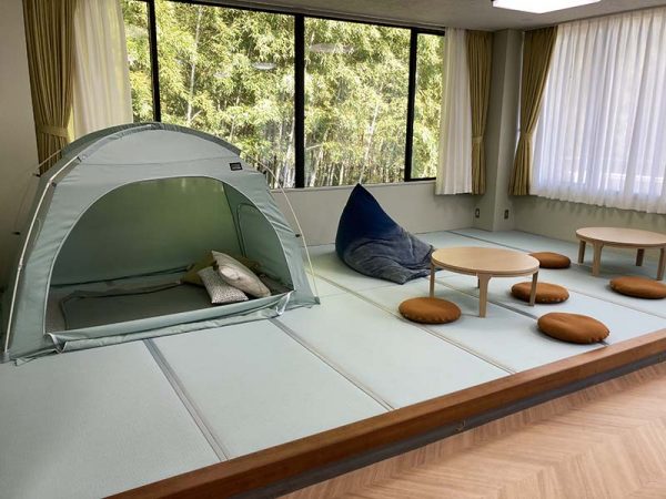 福祉センターだったころに食堂として利用されていた場所を「グランピングカフェテリア」として改装。ここには、室内なのにテントが設置されている。