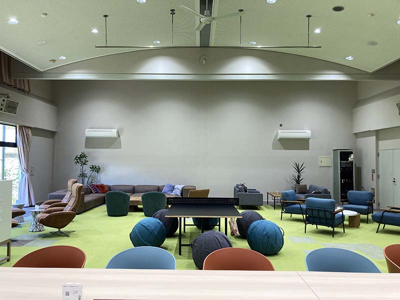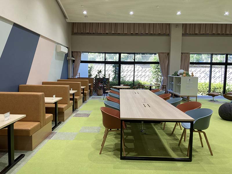 まず案内してもらったのは、コミュニケーションラウンジと一体となったコワーキングスペース。真新しい緑のカーペットがまぶしい広々とした空間だ。