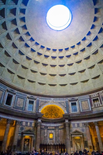 2世紀初頭に完成したパンテオンは、「建築皇帝」と呼ばれるハドリアヌス帝がつくらせた多神教の神殿だ。古代ギリシャの神殿のような列柱とペディメントで構成された入り口の奥に、正円のドーム天井を戴く空間があり、その頂部に丸い穴が空いている。