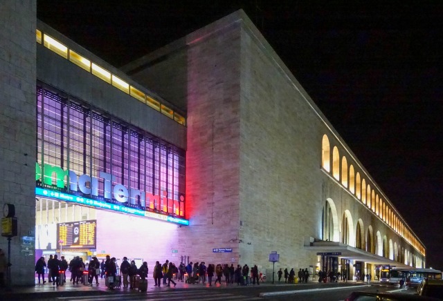 ローマの玄関口、テルミニ駅は第二次世界大戦中に計画・建設が進められ、戦後になって、改めて選ばれた別の建築家が完成させた。ファサードやコンコースは戦後の、アーチが並ぶ背後のウイングは戦中の建物だ。