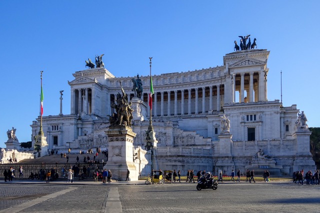 「ヴィットーリオ・エマヌエーレ2世記念堂」は王の没後に計画され、1885年に礎石が置かれた。落成式が行われたのはそれから26年後の1911年、イタリア統一50周年のときだ。設計者のジュゼッペ・サッコーニはすでに亡く、複数の建築家・彫刻家が引き継いでいる。第一次世界大戦後には無名戦士の墓所となり、第二次世界大戦末期には地下が防空壕に使われた。