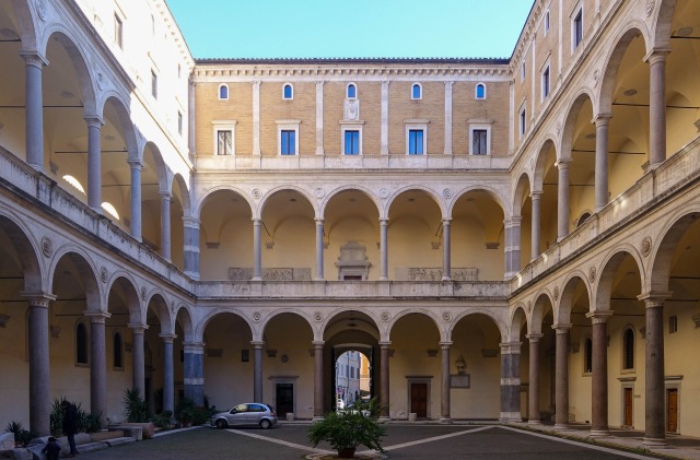 「16世紀ローマを代表するパラッツォで、パラッツォ・デッラ・カンチェッレリーアと比べると技巧的です。1階は石積みの感じを強調し、2階の窓には櫛形のペディメントと三角形のペディメントを交互に並べ、3階は窓がアーチ型になっている。各階の意匠を明確に変えており、盛期ルネサンス建築の見本のような建築です。こうした様式が、やがてフランスに輸入されて城館や宮殿に適用されるわけです」