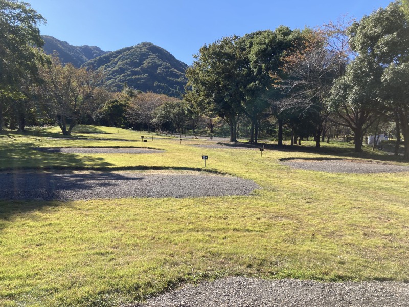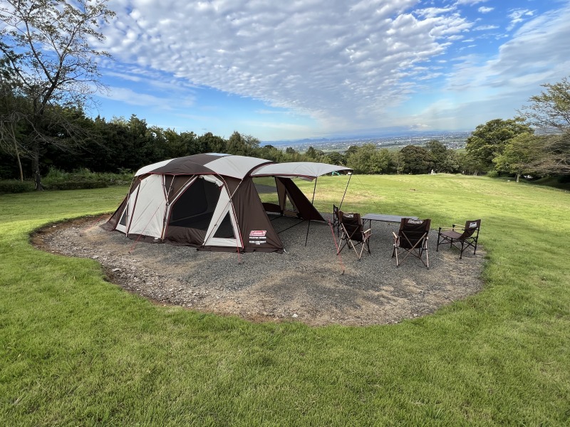 「ここは、もともとゴルフ場だった場所をリノベーションしてつくられたオートキャンプサイトです。丘陵地につくられているので、丘の上のサイトからは濃尾平野が見渡せて、晴れていると御嶽山がとてもきれいに見えるんですよ。最近は本格的なキャンプ道具をお持ちの方が多く、大きなテントを使用したいという方も増えています。そんなニーズに応えられるよう1区画100m2以上とし、ファミリーサイズのテントとタープが一緒に張れる広さを確保しています」