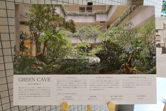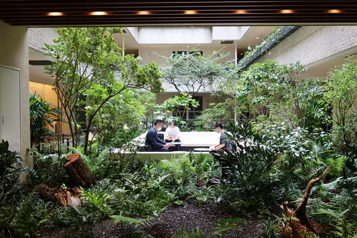 改修にあたり、テーマとされたのがバイオフィリックデザインである。バイオフィリアという概念を具体的な空間づくりに生かしたもので、自然とともにある空間では人はより幸福度を感じ、生産性、創造性が高まるのだとか。そこで延床面積の3割ほどにもあたる共用部を働く場などに改装するにあたり、元気な緑のある空間とすることでそこで働く人も幸せになれる場としようとしたわけである。