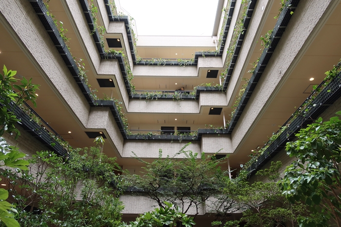 建物全体は片仮名のロの字が縦に伸びたような形状になっており、中央には細長い中庭がある。エントランスを入ってまず目の前に広がるのがその中庭。森のようになっており、一瞬建物を通り抜けて違う場所に来てしまったのではないかと勘違いするほどだが、大丈夫、その森が中庭である。