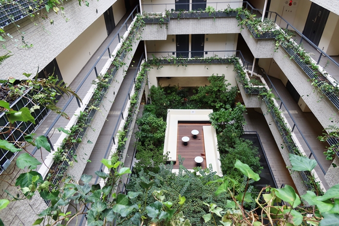 中庭から見上げると庭を囲む各階の手すりにも植栽が施されており、中庭が緑の谷の底であることに気づく。取材時、手すりの植栽はまだ植えられたばかりでそれほどのボリュームではなかったが、いずれは壁を覆うように成長するのだとか。中庭に座り、空を見上げるだけでわが家からどこかの森の中にワープしたような感覚が味わえるのである。