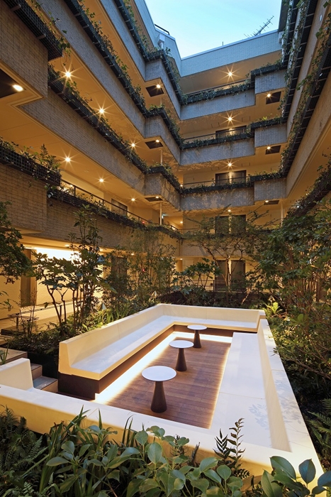 中庭中央にはベンチ、テーブルが用意されており、座ってみると緑に包まれるようで、都心のマンション内にいるとは思えないような空間。総合デザイン監修として携わったスタジオテラの石井秀幸氏によると、リーフコートが建っているのは斜面の窪地で、建物はその原地形を生かして設計されているとのこと。今回はそこに緑を入れることでGreen Cave(緑の谷)を作ったという。